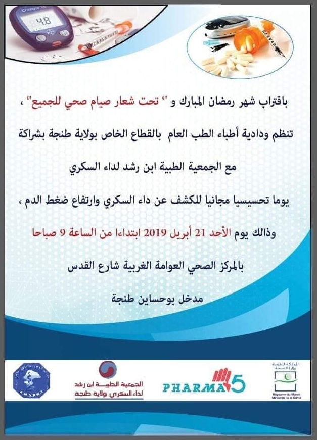 باقتراب شهر رمضان المبارك، وتحت شعار « صيام صحي للجميع »، تنظم ودادية أطباء الطب العام بالقطاع الخاص بولاية طنجة بشراكة مع الجمعية الطبية ابن رشد لداء السكري، يوما تحسيسيا مجانيا للكشف عن داء السكري وارتفاع ضغط الدم، وذلك يوم الأحد 21 أبريل 2019 ابتداء من الساعة 9 صباحا بالمركز الصحي العوامة الغربية شارع القدس، مدخل بوحساين، طنجة.