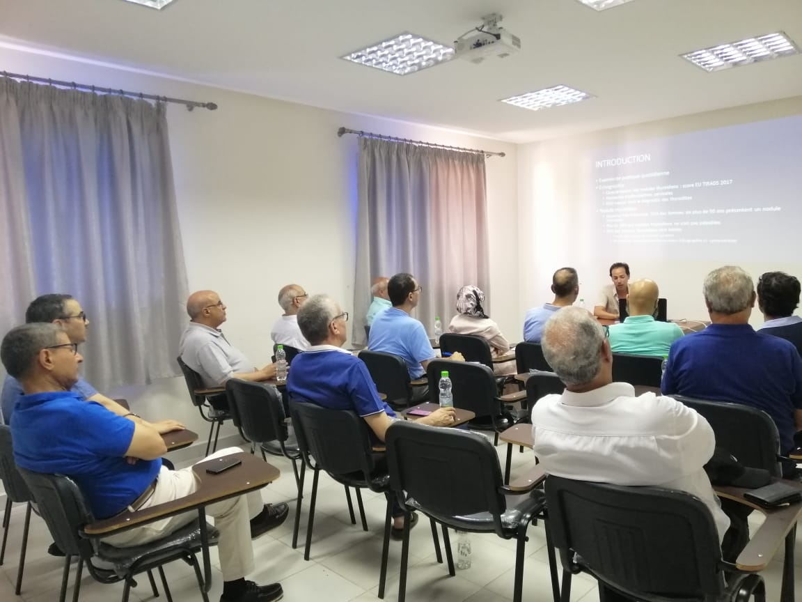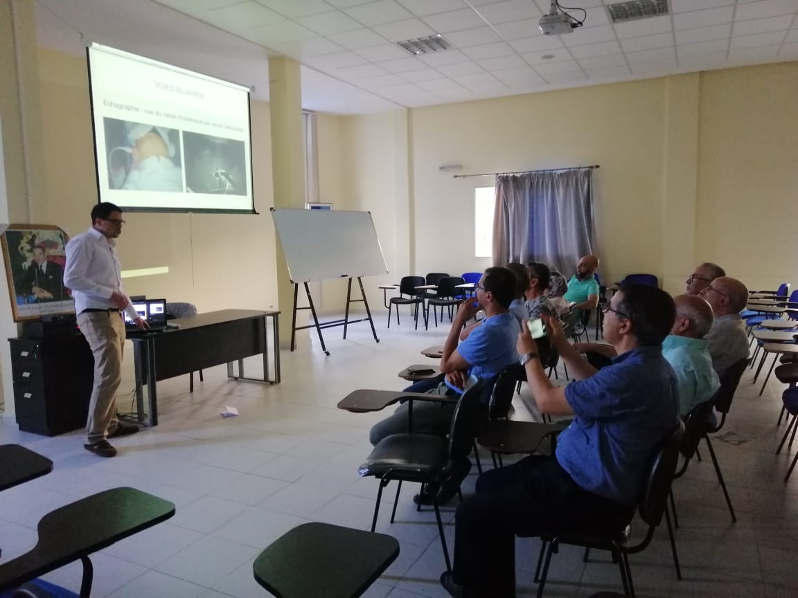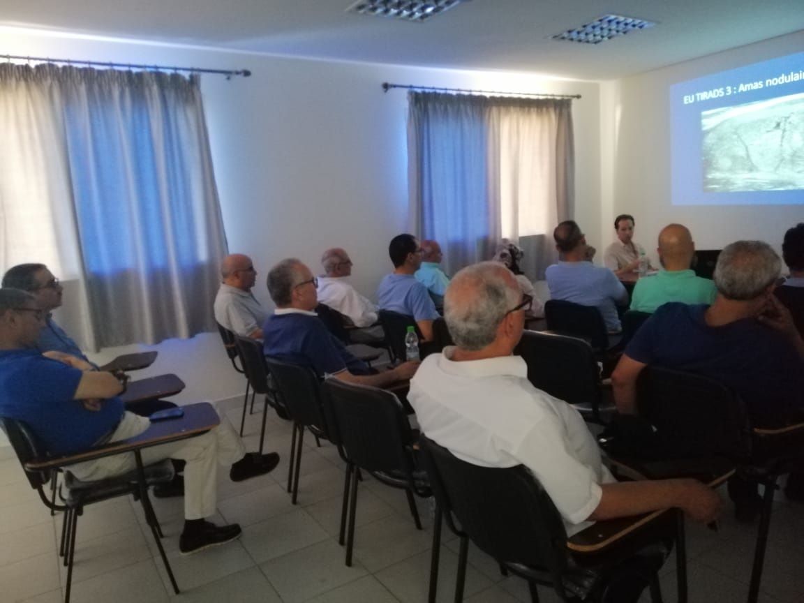 Cet atelier a été animé par Dr A. Bensouda Radiologue au secteur privé de Tanger qui a encadré une séance pratique sur les notions de base de l’échographie abdominale et Dr A. Ben moussa Radiologue au secteur privé de Tanger qui a traité l’aspect fondamental de l’échographie thyroïdienne.