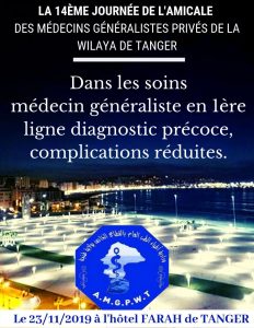 L’Amicale des Médecins Généralistes Privés de la Wilaya de Tanger organise, le 23 Novembre 2019 à l’hôtel FARAH de Tanger, sa 14ème Journée sous le thème de » Dans les soins médecin généraliste en 1ère ligne diagnostic précoce, complications réduites ».